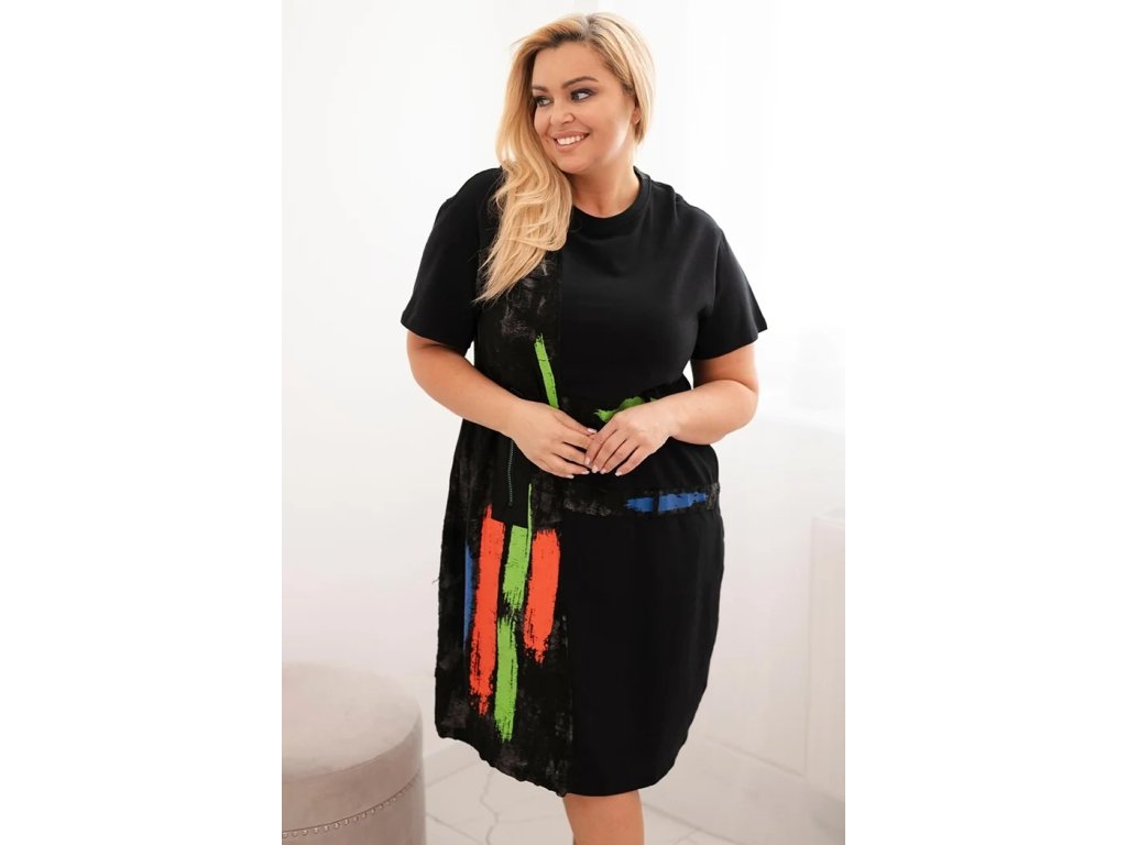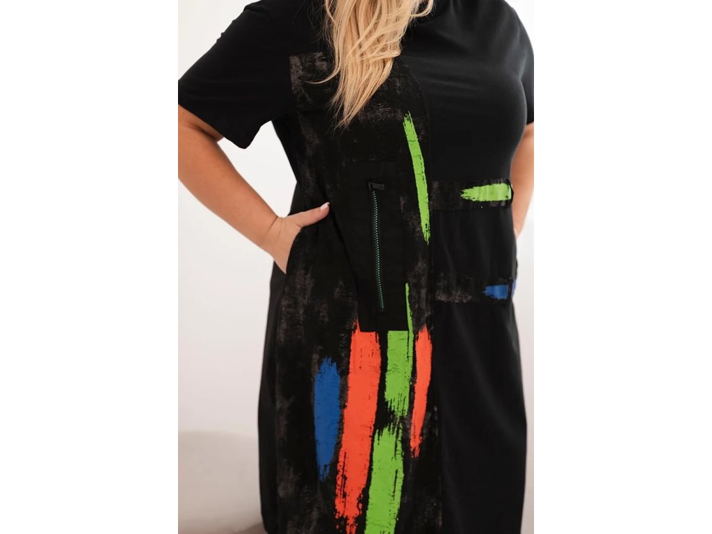 Pohodlné a originální – tyto dámské šaty s krátkým rukávem zaujmou moderním, uměleckým potiskem v neonových barvách. Jejich volný, oversize střih zaručuje volnost pohybu a skvěle padne na každou postavu. Funkční boční zip nejen usnadňuje oblékání, ale je i zajímavým dekorativním prvkem. Ideální volba pro každodenní nošení – do práce, na nákupy nebo na setkání s přáteli. Šaty dokonale spojují pohodlí s jedinečným stylem. Model je určený pro ženy nosící velikosti Plus Size – XXL, XXXL a větší.